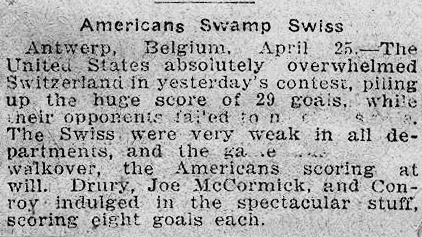 On Sunday April 25th at 5 PM, the Americans swamped the Swiss with the very unsporting score of 29 goals to nil.